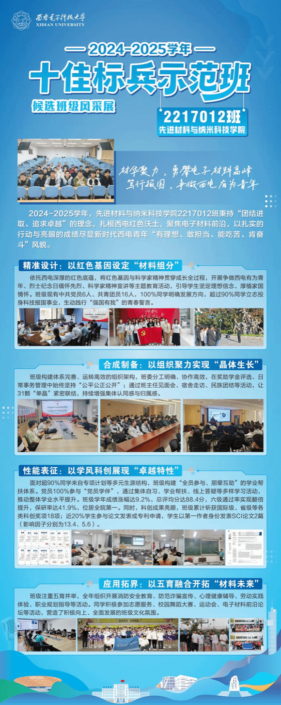 (通讯员 张闻功)近日,2024-2025学年 “十佳标兵示范班”评选答辩会在图书馆四楼报告厅圆满落幕。材料院2217012班经班级申报、学院推荐、学校材料复审、辅导员推介、班级代表答辩等多轮严苛角逐,2217012班凭借扎实的班级建设、突出的学风成果与全面的综合素养,成功斩获校级“十佳标兵示范班”荣誉称号,充分展现了新时代西电青年“有理想、敢担当、能吃苦、肯奋斗”风貌。