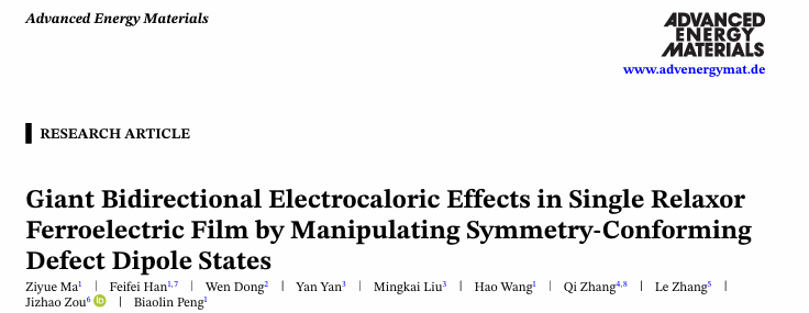 相关研究成果以“Giant Bidirectional Electrocaloric Effects in Single Relaxor Ferroelectric Film by Manipulating Symmetry-Conforming Defect Dipole States”为题,发表于材料领域顶级期刊《Advanced Energy Materials》 (2025年影响因子26.8)。成人电影
