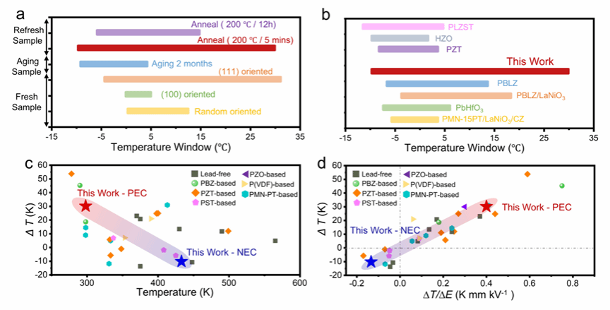 彭彪林教授团队在弛豫铁电薄膜中提出了“对称性匹配缺陷偶极态调控”新思路。通过调控缺陷偶极在不同热激活条件下的对称性匹配行为,使薄膜在不同温区呈现截然相反的电卡响应,从而在同一材料体系内实现了PEC与NEC的协同与可编程调控。该研究在(111)取向的PNNZT弛豫铁电薄膜中取得了显著的电卡温变结果 ,并展示了温区可调的双向电卡能力,为发展硅基兼容的高效固态制冷技术提供了新途径。该研究将“缺陷偶极的对称性匹配状态”作为一个可设计与调控的关键自由度,在弛豫铁电薄膜中实现了巨幅双向电卡效应与温区可编程性能,为面向芯片级热管理的高效固态制冷材料与器件设计提供了新的通用策略。