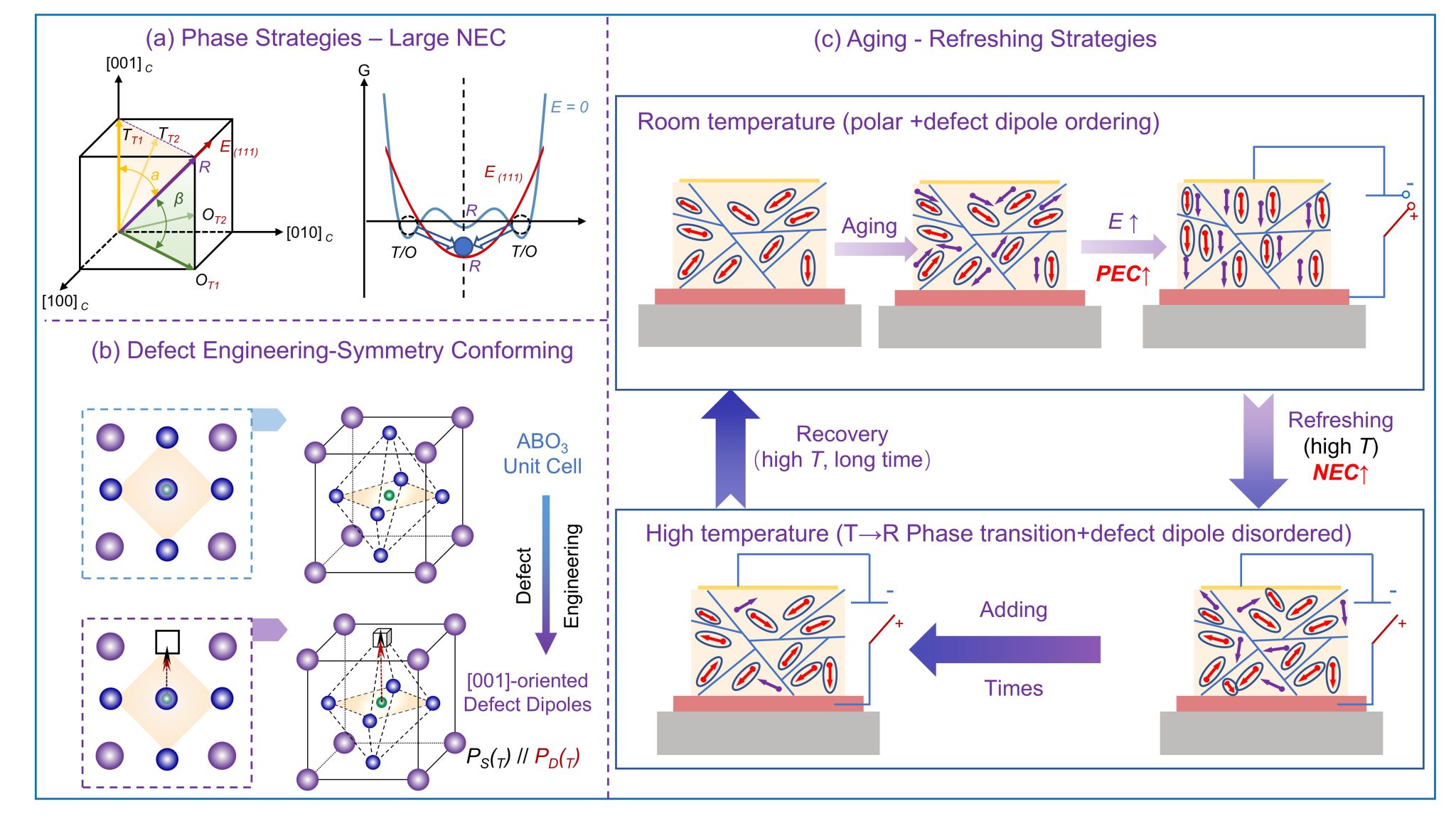 图1 展示了本研究的核心策略:以相结构设计与缺陷工程为基础,通过操控缺陷偶极与铁电本征极化之间的对称性匹配关系,并借助“时效处理与恢复”过程对缺陷偶极状态进行动态调控,从而构筑了一个兼具正/负电卡效应(PEC/NEC)且温区可调的双向电卡体系。该框架阐明了在同一材料中实现可编程、巨幅双向电卡响应的物理机制与实现路径。