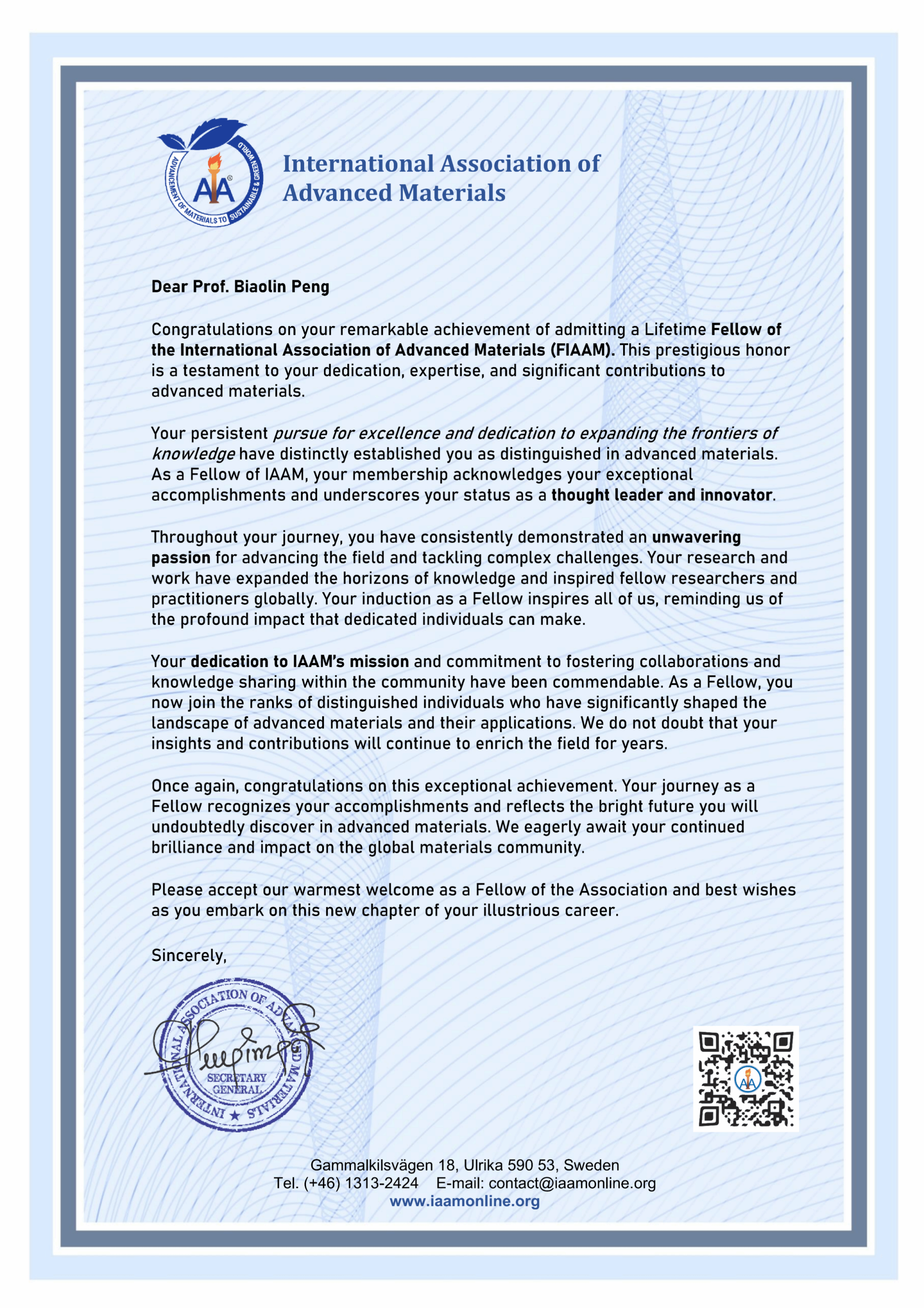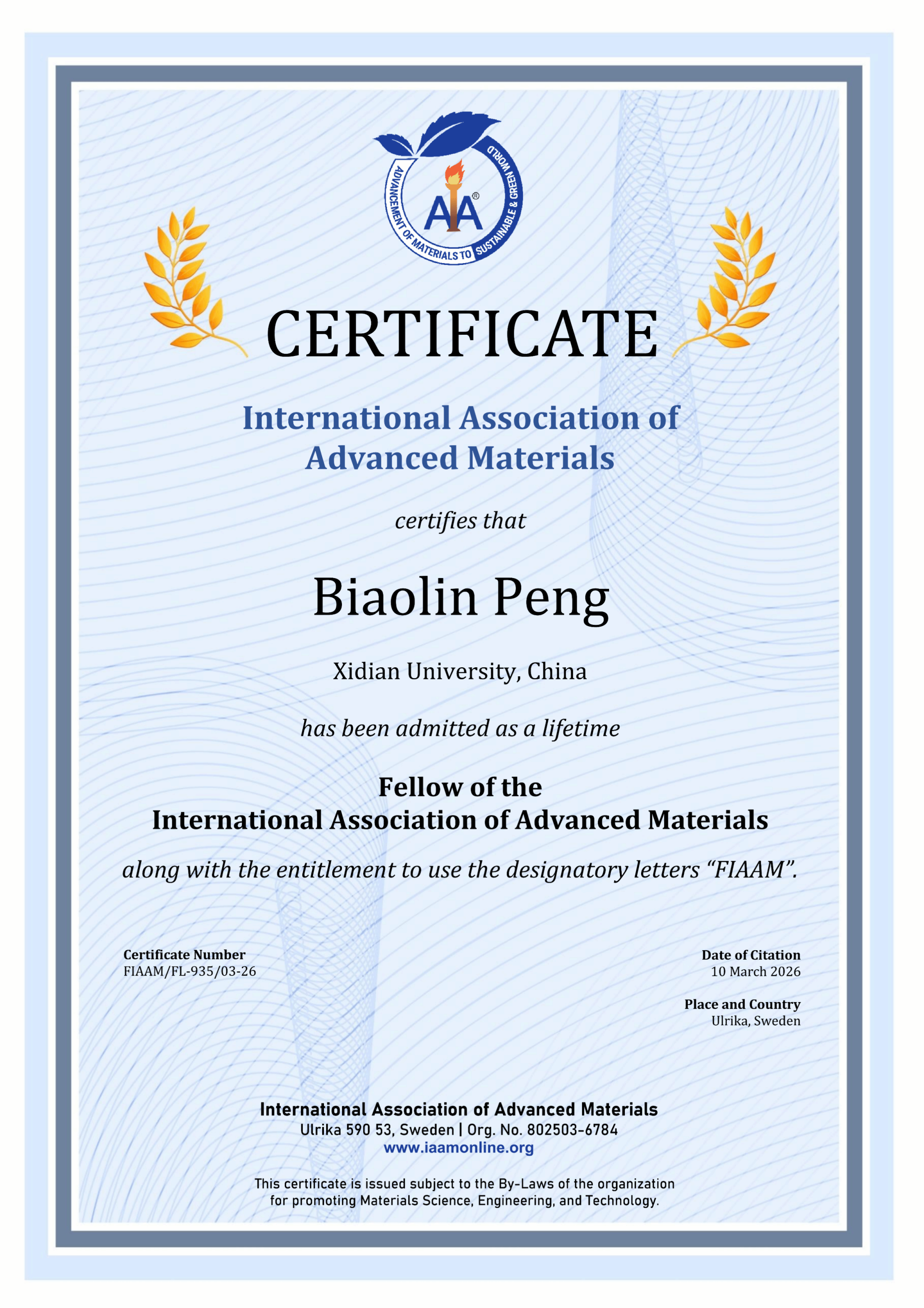 彭彪林教授凭借其在先进功能材料领域的突出贡献,当选为国际先进材料学会终身会士(IAAM Lifetime Fellow)。这一荣誉是对其科研成就的高度认可,也彰显了学校在材料科学领域不断提升的国际影响力。