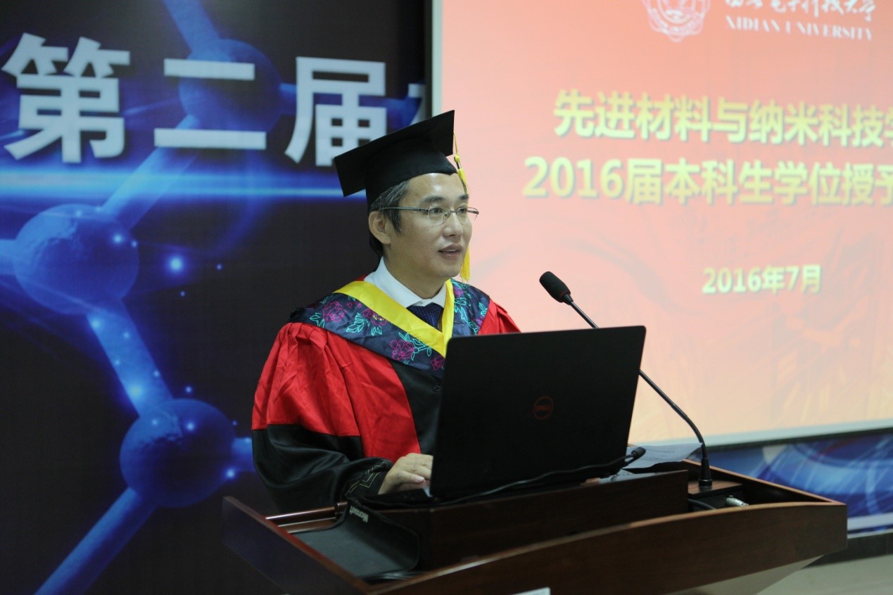 2016届本科生学位授予仪式在G楼118报告厅隆重举行,材料院迎来建院以来的第三届本科毕业生,从西电起航,踏上新的人生征程。中国科学院院士、西电副校长、学院院长郝跃,党委书记黄伟,学位评定分委员会成员、教师代表、班主任代表、毕业班辅导员以及2016届本科毕业生参加了本次授位仪式。仪式由执行院长史小卫主持。
