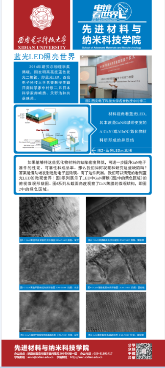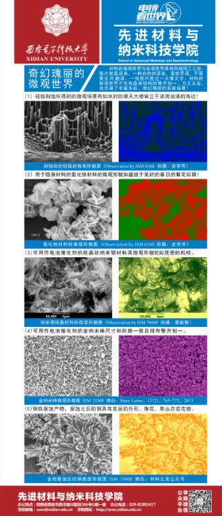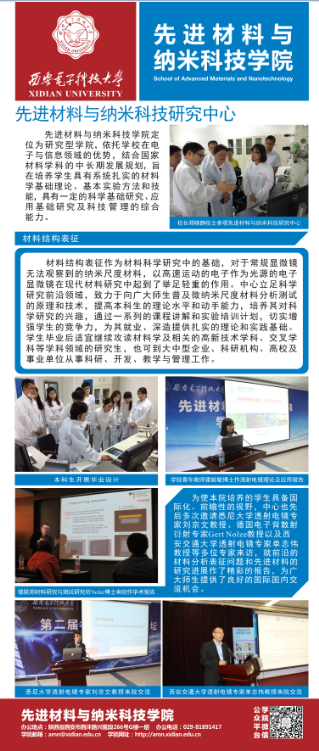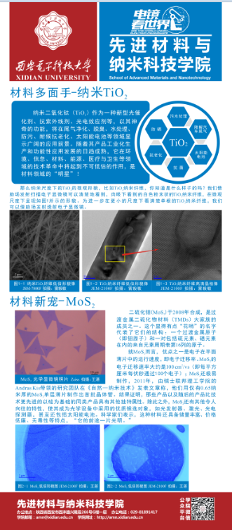 本期展板涵盖“蓝光LED照亮世界”、“材料多面手TiO2”、“材料新宠MoS2”、“奇幻瑰丽的微观世界”、“先进材料与纳米科技研究中心介绍”等5个模块内容,通过展示教师和学生日常研究工作中所拍摄的生动有趣的GaN薄膜、TiO2纳米纤维以及MoS2透射电镜和扫描电镜系列图片,向新生全面传递了西电材料院的专业特色,即依托学校在电子与信息领域的优势,结合国家材料学科的中长期发展规划,在新能源材料与器件、薄膜材料与器件、纳米材料与器件等方面所开展的新型特色的材料研究。同时,本期展板也系统介绍了先进材料与纳米科技研究中心的成立背景、仪器设备情况以及中心人员。新生们不仅了解了学院雄厚的平台设施,同时感受到了学院浓厚的科研范围,对自己未来从事材料专业学习和研究有了极大的信心。(完)
