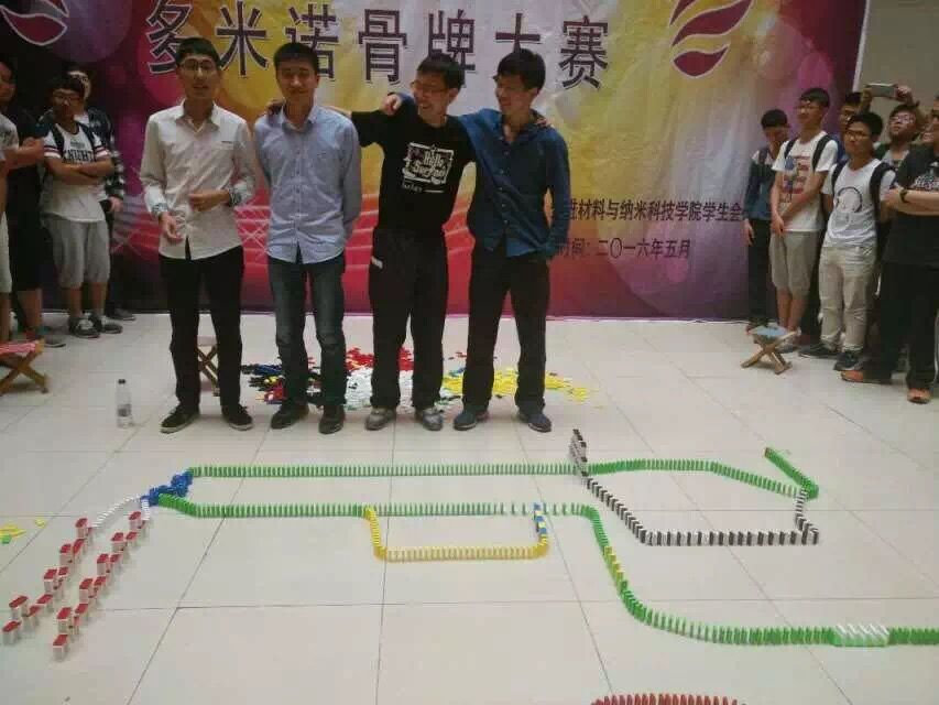 当天共有三支来自不同学院的队伍进行比赛。在12号楼稍显逼仄的大厅里,选手们全情投入,专注于眼前的骨牌。只见一个个造型在选手们的手中成型,每一个都极具创意。工作人员询问得知,这些骨牌的造型基本上都是参赛团队自主设计的,包括每一个骨牌的摆放都是团队自己实验得到。有时刚摆好的骨牌被不慎推倒,选手们也不气馁,迅速调整心态,重新再来。