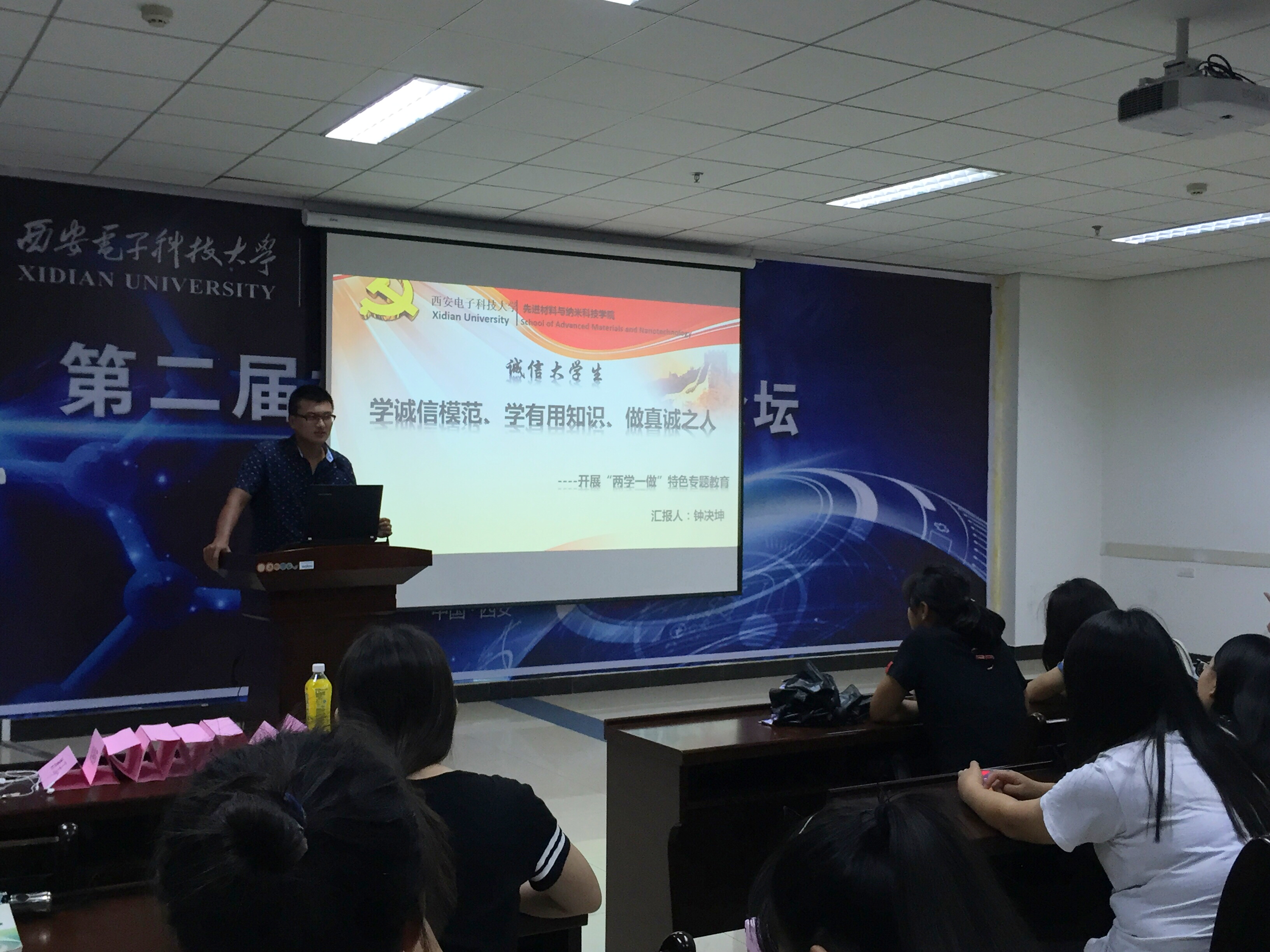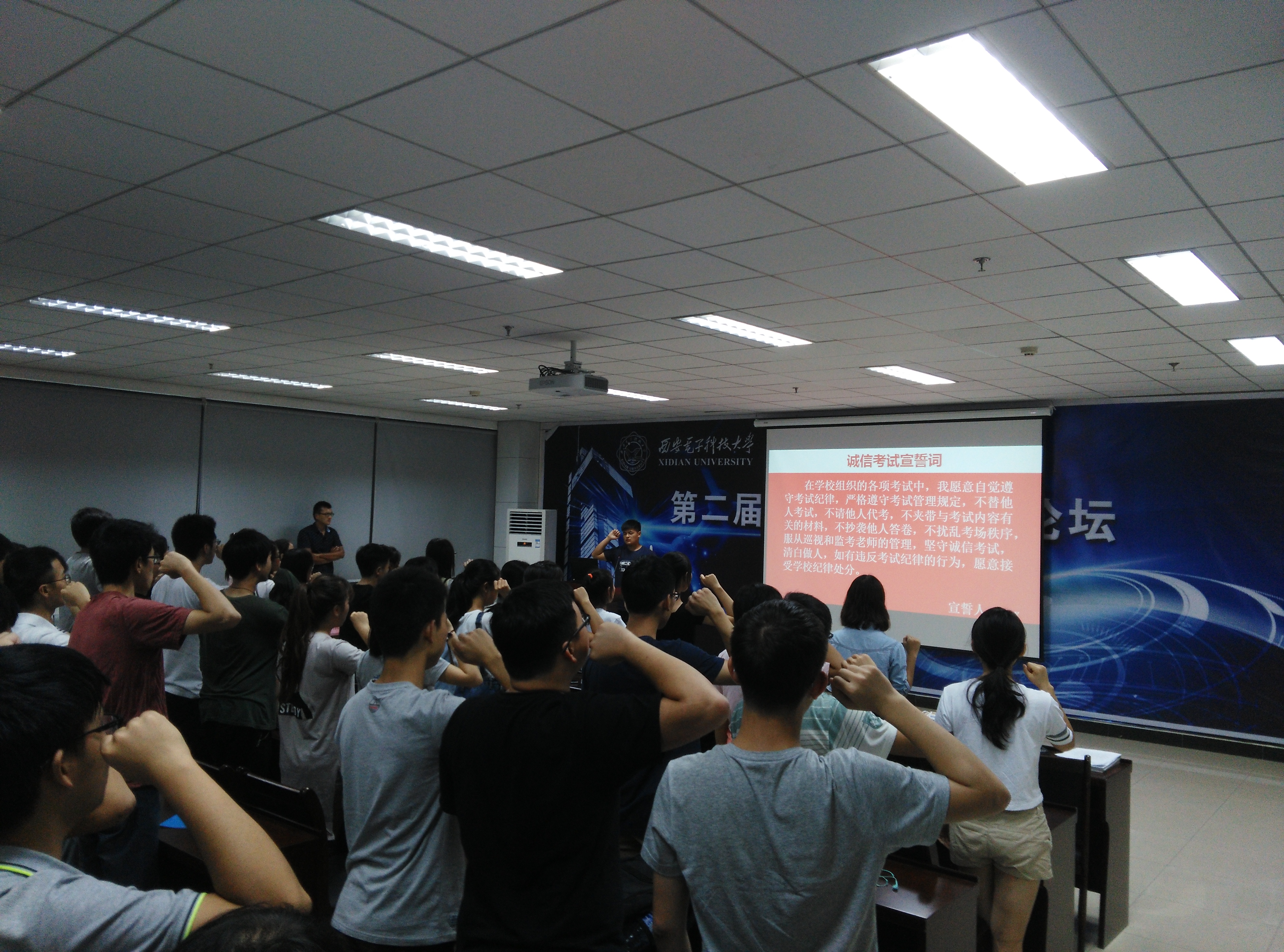 2015级辅导员钟决坤在G-118报告厅,举办了“诚信大学生,诚信考试”专题教育活动,全体大一学生参会。活动中,辅导员钟决坤紧扣主题,从“行”、“考”、“职“、“课”四个方面着重解释此次专题“诚信教育”,并融入当代热点事例分别对这四方面内容加以分析,激励每位同学“学诚信模范,学有用知识,做真诚之人”。最后在钟决坤的带领下,全体大一学生郑重宣誓,争做诚信大学生,争创学院优良学风。