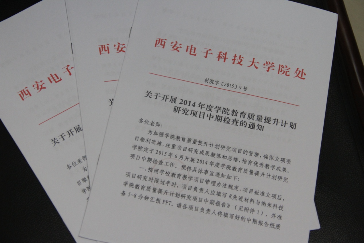 认真落实学校《关于进一步提升本科教育质量的若干意见》,全面实施本科教育质量提升计划,多次召开教育质量提升计划研讨会及推进会。针对质量提升中期检查,学院下发了《关于开展2014年度学院教育质量提升计划研究项目中期检查的通知》(材院字〔2015〕9号),本次中期检查是学院进一步落实教育质量提升计划,督促项目开展并进行改进的重要举措。(完)
