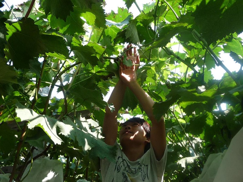 7月26日,实践队到达目的地——户县李家庄,一位热情的村民带领我们前往户太八号葡萄种植田地,放眼望去,皆是一片生机勃勃的绿意,队员们情不自禁的想体验下大自然带给我们的美感。