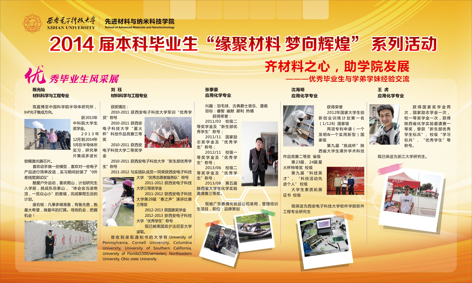 交流会于19点正式开始,材料院材料专业和化学专业共五位学长学姐出席了本次交流会。首先接受同学们提问的是材料专业的刘珏学姐,她在大学期间曾获得国家奖学金一次,校级奖学金若干次,并在大四上学期选择留学至美国宾夕法尼亚大学。她在回答学弟学妹们关于出国深造的问题时提到:一个人保持清醒的头脑是在留学道路上一个重要的素质,我们的本科生不能将出国留学当作神圣的、高不可攀的活动,而是当作自己开阔眼界、增长见识的途径,并时刻保持自己为国争光,报效祖国的信念。应用化学专业保送浙江大学的王虎学长曾数次获得“优秀学生标兵”的称号。他从生活、读研和大学生兼职三方面对学弟学妹们提出了自己的宝贵意见。他认为,必须看清楚上研或工作的本质,读研其实也是另一种工作平台或者说是另一种工作环境,要在为自己上研的奋斗过程中找准自己的目标和关注点,时刻提醒自己努力奋斗。随后,王虎学长分享了自己参加浙江大学夏令营的经历和经验。随着交流会的进行,材料院保送中科院半导体所研究生的陈光灿学长、竞赛达人沈海明学长和工作标兵张攀豪学长分别分享了自己的大学生活心得体会。