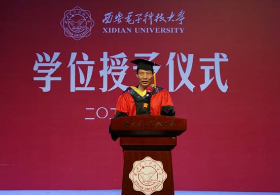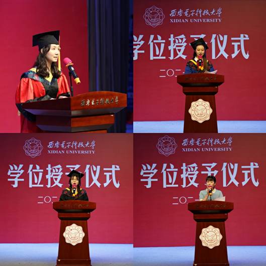 赵思佳代表本科毕业生发言。她回顾了四载春秋寒暑、酸甜苦辣,诉说心中感念、无限眷恋,祝福母校桃李芬芳、续写辉煌,誓言传承西电精神、书写西电现象。