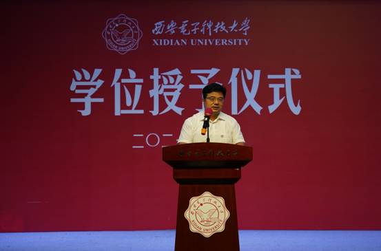 杨如森副院长代表学院领导致辞。杨如森回顾了同学们在四年的奋斗与蜕变,尤其是肯定了在他们抗疫战斗、主动学习党史中所展现的家国情怀、责任担当等崇高品质。同时,他以我国航天事业突飞猛进发展为例,以航天事业中的杰出校友张荣桥、党蓉、杨宏的巨大贡献为榜样,发扬西电人“姓党·爱国·为民”的精神特质,鼓励同学们在科技强国的新征程中创新进取、奋发有为、不辱使命。