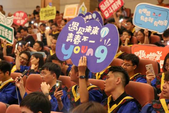 最后,毕业生刘欣、胡亚宁深情演唱改编歌曲《你曾经是少年》。台下毕业生也情不自禁地随着音乐哼唱,高高地晃动手中的祝福标语。歌声传递的是感恩、是祝福、是希望、是不舍、是怀恋,万千思绪、万语千言,终将化成每位毕业生心底珍藏的老唱片,伴随他们走向永远。