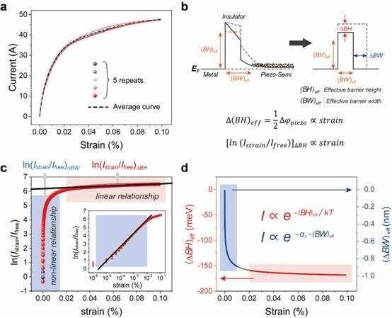 图3.(a)Ag/HfO2/n-ZnO PTSS的电流响应图。(b)隧道结的能带图。(c)ln(Istrain/Ifree)与应变的函数关系曲线。(d)由(c)推导出的有效势垒高度和宽度的改变量与应变的关系曲线。