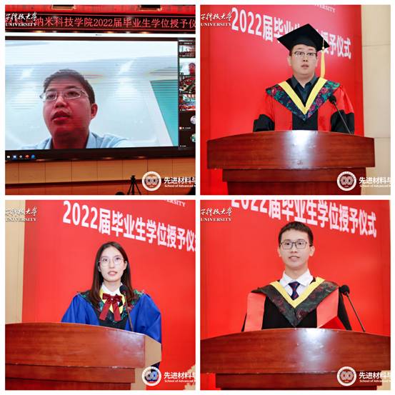 2022届毕业生学位授予仪式在南校区隆重举行。学院名誉院长、中国科学院外籍院士、欧洲科学院院士、加拿大工程院国际院士、自驱动智能系统与传感学科方向负责人王中林在线出席了仪式;华为西安研究所高校系统部部长李桂宝、数据存储产品线研发专家罗卫作为企业嘉宾参加了仪式;包括国家级教学名师、国家级领军人才、涂层薄膜材料与器件学科方向负责人周益春教授,半导体与信息材料学科方向代表胡英、张显、张茂林教授,省级青年人才、新能源材料与电化学学科方向负责人吴巍炜副教授,省级青年人才仲鹏副教授、周龙老师等在内的教师代表20余人,以及学院党政领导、学院2022届全体毕业生、本硕博在读学生代表等通过线上线下方式齐聚一堂,共同见证了148名材料学子别开生面的“最后一课”。