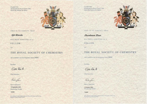 Ajit Khosla和赵振环当选英国皇家化学会会士(Fellow of the Royal Society of Chemistry, FRSC)。