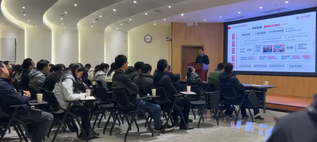 学院副院长施建章对学院近五年教育教学相关工作作总结汇报,他重点阐述当前学院人才培养中存在的教学突出问题,希望教师能够提高认识,不断提升业务能力和教学质量,成为业务精湛的高素质教师,并且要严抓课堂学风建设,提高学生课堂抬头率,保障课堂教学质量。