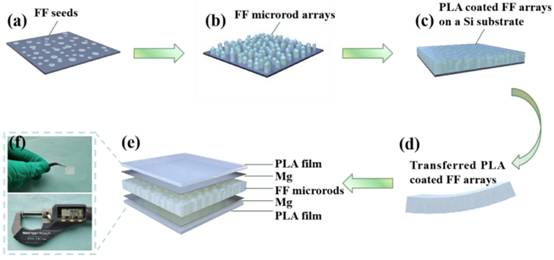 我们报道了一种基于嵌入苯丙氨酸二肽微棒阵列的可降解压电纳米发电机。该器件的最大输出电压为1.78V,功率密度为1.56W m-3。器件在碱性溶液、酸性溶液和磷酸盐缓冲盐水溶液中25天后完全溶解。可降解的纳米发电机为瞬变电子供电提供了可行的解决方案。