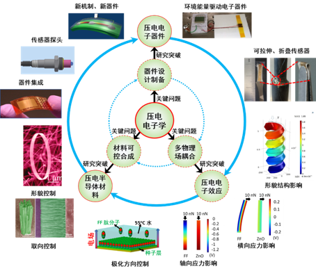 开发生长方向和极化方向可控的第三代半导体、二维材料、生物材料、铁电薄膜等高质量压电半导体材料,研究压电极化电荷和光电子对多种结区的界面载流子产生、传输、分离和复合的影响,结合理论计算建立应力/应变对半导体输出信号的精确调控系统,发展基于压电电子学效应的高灵敏度传感器、电子皮肤、电卡致冷、以及铁电移相器等器件,推动在军事、无线通信和传感、智能材料等领域的应用基础研究。