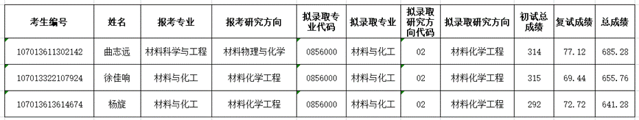 录取资格。”补录的三位同学录取专业为材料与化工,录取研究方向为材料化学工程。专业调整的考生须通过中国研招网调剂系统进行调剂录取(学院将开放调剂系统进行录取),专业未调整的考生直接拟录取。补录名单公示如下: