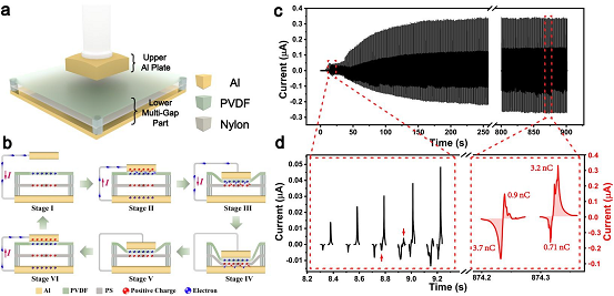 基于此,在这项工作中,我们开发了一种具有多间隙结构摩擦层的新型TENG,这些间隙的存在会在摩擦层之间产生更多的接触,从而产生更多分离的摩擦电荷和更多的输出电荷量。此外,这些间隙还使TENG在每个驱动周期中产生更多的输出电流脉冲,这意味着输出电流的频率将是驱动频率的几倍。在一个驱动周期中,在摩擦层中没有间隙的一般TENG产生2个电流脉冲,并输出0.23 nC/cm2单位面积电荷量,而在摩擦层中具有7个间隙的TENG产生大约14个电流输出脉冲,并且输出294 nC/cm2单位面积费用数量,是目前记录值的1.18倍。这项工作将有助于TENG的性能快速提高并加快其应用。