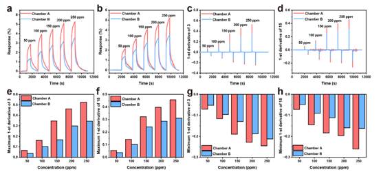 图4反式丁烯二酸掺杂聚苯胺传感器对2-己酮响应特性的比较。(a)3号和(b)15号传感器在不同腔室中的时间-响应恢复曲线图,(c)3号和(15)号传感器在不同腔室中的响应一阶导数变化图,3号传感器(e)响应阶段最大和(g)恢复阶段最小一阶导数直方图,15号传感器(f)响应阶段最大和(h)恢复阶段最小一阶导数直方图。