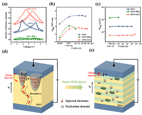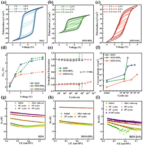 研究团队制备并对比了如图1(a)三种不同异质层状HZO基铁电薄膜结构,采用压电力显微镜对电畴翻转特性进行表征,并结合如图2(a-c)电滞回线结果分析表明HZO-ZrO2铁电薄膜具有优异的铁电极化特性和较低的矫顽电压(图2(d))。其在饱和电压下的耐久性可达1012次循环,相对于HZO薄膜耐久性提升3个数量级以上。随着研究的深入,团队发现随着疲劳电场循环次数的增加,HZO-ZrO2铁电薄膜材料漏电机制逐渐趋于陷阱辅助隧穿模型(图2(g-i)),这证明了疲劳循环过程中带电缺陷的产生是诱发漏电流和导致击穿型疲劳失效的根本原因。并且该材料在不同疲劳循环次数下,均能保持相对较低的漏电流密度(图2(f))。