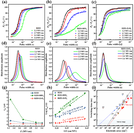 图3.三种结构Hf0.5Zr0.5O2基薄膜极化翻转速度及Lorenz翻转动力学拟合结果图