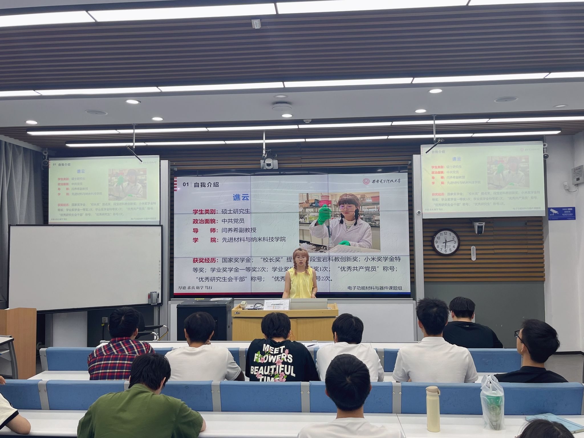 的谯云同学分享了取得国家奖学金的科研之路。她结合自身的学习和科研经历,从目标设定、学习方法、科研实践、时间管理等多个方面进行了毫无保留的分享。她强调,获得国家奖学金不仅需要优异的学习成绩,更要有勇于探索的科研精神和服务社会的责任感。她的分享干货满满,让同学们深受启发,现场不时响起热烈的掌声。