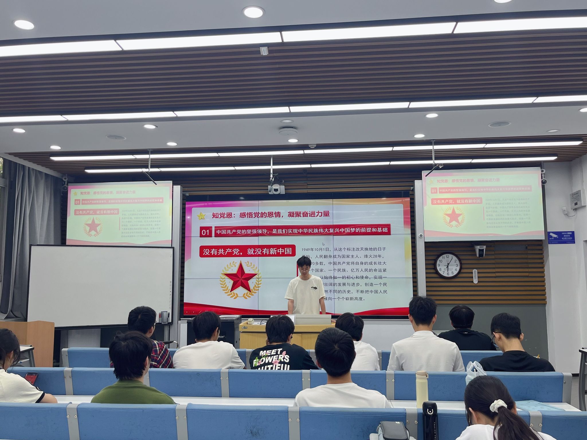 活动伊始,生科院的学生党员周柯成同志围绕"听党话,知党恩,跟党走"这一主题展开了精彩讲解。他从党的光辉历史出发,结合当下时代发展,深入浅出地阐述中国共产党在长期奋斗中积累的宝贵经验和伟大精神,并强调听党话是思想自觉,知党恩是情感认同,跟党走是行动追随。周柯成生动的讲解让在场的党员和积极分子深刻认识到党的领导是中国特色社会主义最本质的特征,进一步坚定了大家紧跟党的步伐、为党和人民事业奋斗的信念。