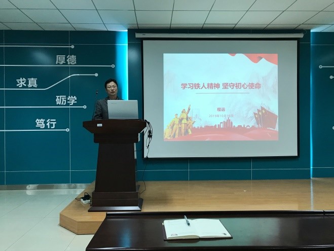 党委开展“不忘初心、牢记使命”主题教育实施方案,结合学习和调研成果,2019年10月16日上午,学院党委副书记程远为2018级硕士研究生党支部讲了一堂生动形象的党课,主题为《学习铁人精神 坚守初心使命》。活动由支部书记李鑫主持,2018级全体党员和积极分子参加。