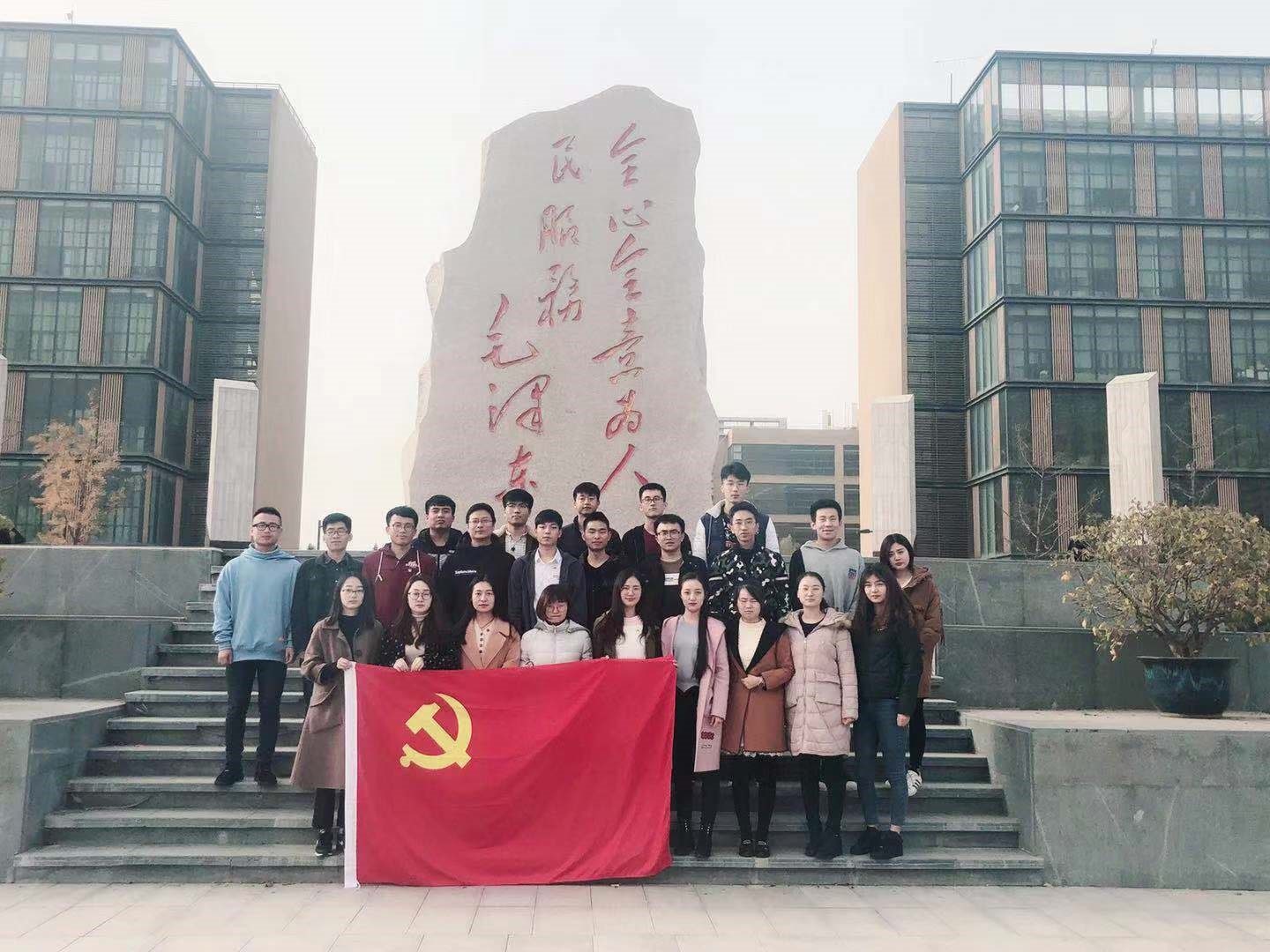 最后,全体参会人员在校门口纪念碑前合影留念,支部第二次党员大会圆满结束。