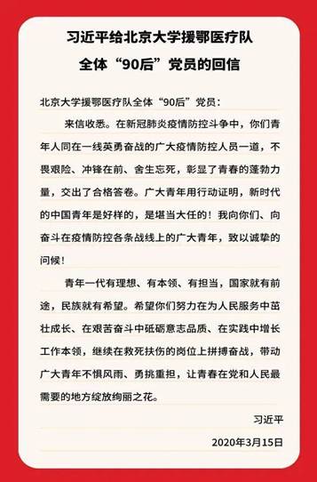 3月15日,中共中央总书记、国家主席、中央军委主席习近平给北京大学援鄂医疗队全体“90后”党员回信,在信中赞扬了他们的担当与责任,肯定了当代青年勇于奋战在抗击疫情的第一线,鼓励着青年一代迎难而上、越战越勇、不负重托,并向他们和奋斗在疫情防控各条战线上的广大青年致以诚挚的问候。3月19日晚上,成人电影