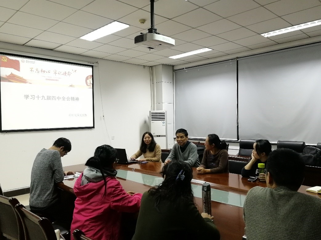 为深入贯彻落实学校党委关于开展“不忘初心、牢记使命”主题教育相关要求,积极响应学校、学院党委号召,2019年11月8日下午,应用化学系支部在G119会议室召开了“学习十九届四中全会精神”会议,集中学习《中国共产党第十九届中央委员会第四次全体会议公报》;全体党员参加。