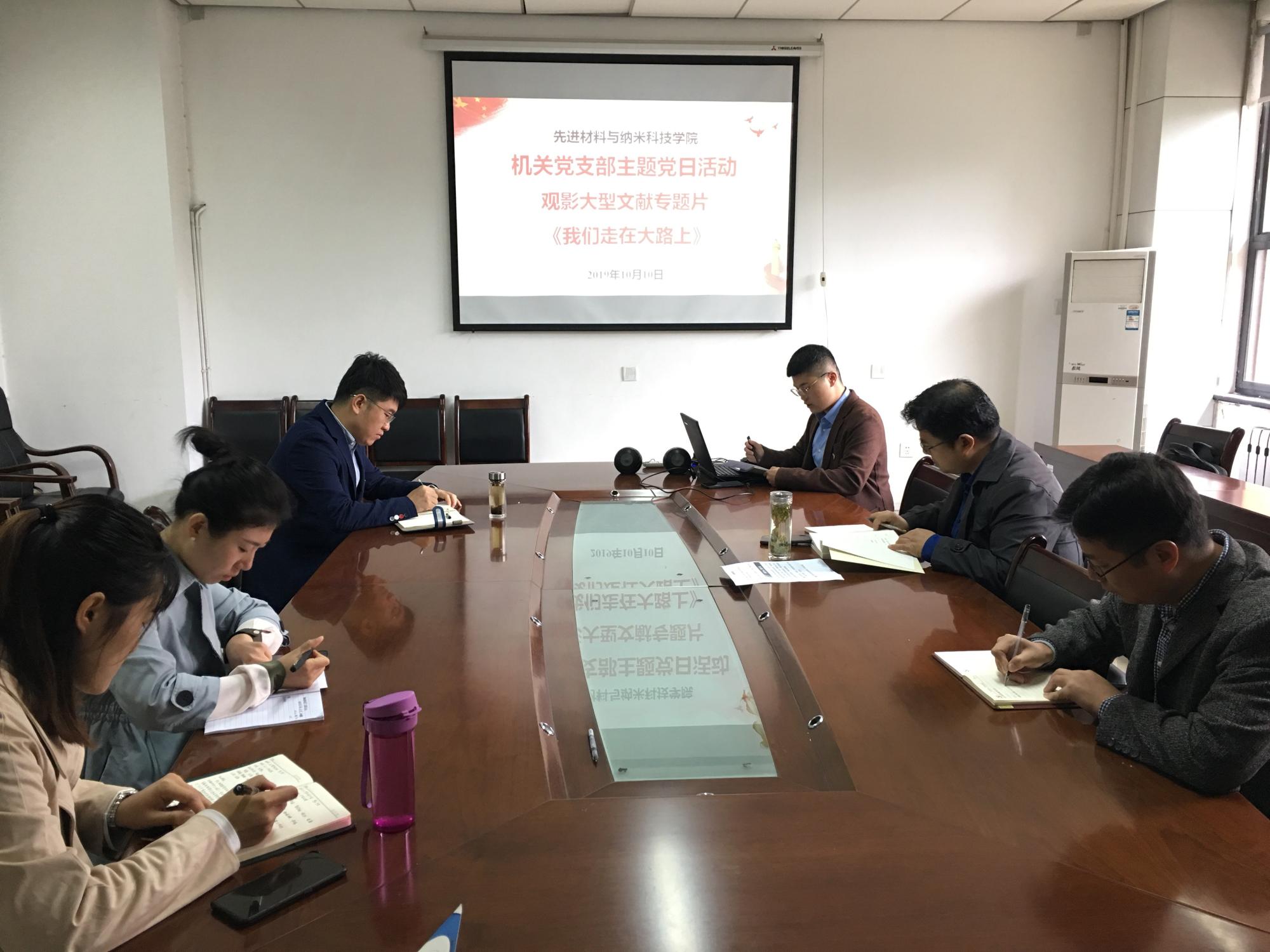 机关党支部在G119会议室开展了“我和我的祖国” 红色观影主题党日活动。活动中支部全体党员一起观看了大型文献专题片《我们走在大路上》第一集——新中国诞生,聆听历史回音,追寻红色记忆,接受红色洗礼。学院领导干部卢硕、程远、高宝铜以普通党员身份参加了本次主题党日活动,活动由支部组织委员赵秉正主持。