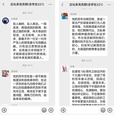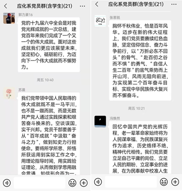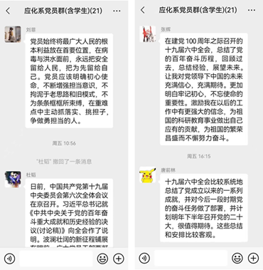 (通讯员 李淑萍)党的十九届六中全会于11月8日至11日在京召开,为了深入学习宣传贯彻党的十九届六中全会精神,应用化学系党支部于11月11日在支部微信群上及时通知党员结合11月11日下午和晚上的新华社通稿、央视《新闻联播》等,跟进学习十九届六中全会公报、《中共中央关于党的百年奋斗重大成就和历史经验的决议》等,迅速掀起学习宣传热潮。在微信群里,大家进行了热烈的讨论并纷纷发表了自己学习后的心得体会。
