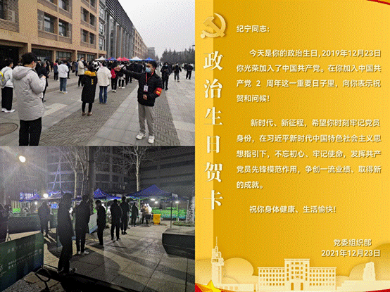 数九寒冬,气温跌到了冰点,学生党员纪宁、入党积极分子王磊等同学作为“疫情防控先锋岗”志愿者在学校各个核酸检测点前忙碌着。他们的主要工作是维持核酸检测现场秩序,提醒前来检测的师生保持一米以上安全距离,督促师生扫码登记核酸采样时间,此外还要帮助医护人员清理检测台的垃圾等。在入党2周年政治生日这天坚守抗疫一线,意义非同寻常,纪宁坚定地说道:“有召必来!我和一批同学深夜迅速集结,凌晨准时上岗,这是共产党员的使命。相信同心战役,就能共克时艰,艰难的时光总能过去,西安加油!考研加油!”“00后”学生党员们充分展现了不怕苦、不畏难、斗风险、担责任的激昂青春风采。