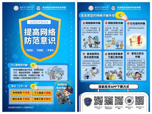 近年来,⼤学校园诈骗案件花样不断,案值不断增⼤,部分不法分⼦利⽤在校学⽣阅历浅、安全防范意识差等弱点,潜⼊校园诈骗钱财。针对这一现实问题,在开展活动之前,学员武新明同志为本次主题宣传活动设计了干货满满的宣传海报,宣传海报向同学们列举了6种高发类型的网络诈骗手段,普及了“三不一多“的防诈骗方法,并且宣传了国家反诈APP的下载方式。
