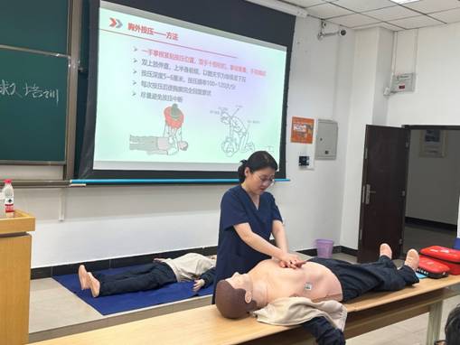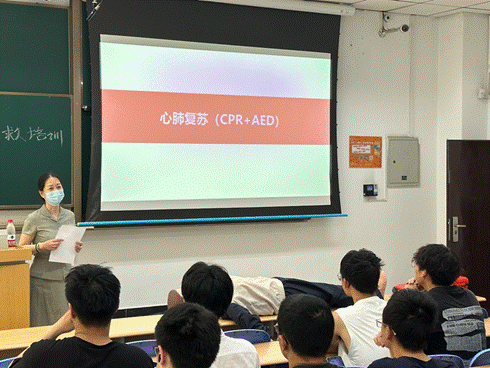 此次培训的主要内容是心肺复苏相关知识、技术及AED操作流程。培训中,肖薇对“心肺复苏”急救知识进行了细致地讲解,通过演示相关图片和视频,让师生掌握判断心脏骤停的方法,了解到心肺复苏的流程和要领。肖薇告诉师生,遇到紧急情况,在确认安全环境的前提下,急救人员应快速评估患者意识、指定在场人员帮助拨打120和寻求AED设备,同时请求掌握AED急救方法的人员协助,尽快实施心肺复苏急救,心肺复苏必须争分夺秒,复苏越早,存活率越高,急救人员应最大程度上给予患者生命支持。