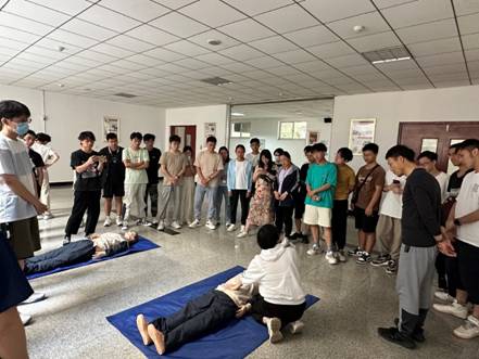 随后,肖薇通过对模拟人实施心脏复苏抢救以及AED的模拟使用,向师生们演示了如何判断检查患者有无意识与自主呼吸,口腔异物的检查与清理,人工呼吸与AED的相关操作流程。在演示过程中,肖薇反复示范正确急救操作的步骤及手法,力争每位参训人员都能掌握心肺复苏的技巧。在实践操作时,师生们分组依次进行心肺复苏实际操作演练,按照相关流程规范使用AED设备。通过现场的实际操作教学,进一步提高了参训人员对急救操作的了解程度和心肺复苏操作的规范程度。