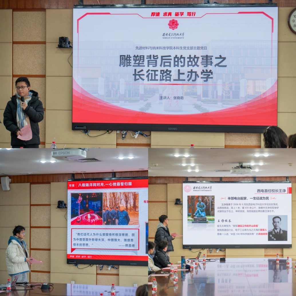 活动伊始,学生代表分别做“弘扬科学家精神”和“传承红色校史”主题宣讲。学生徐佳勋以“追寻师老精神,赓续材料星火”为主题,讲述了中国材料之父师昌绪先生在振兴中华理想指引下,深扎航空材料研究,解决国家重大需求,一心科技报国的事迹,激励有志于科学事业的学生不断发起冲锋、占领科研高地。张晓萌、相里濡甲讲述了“长征路上办学”“王诤”两座校园红色雕塑所蕴含的红色故事,展示西电延续中国最长红色根脉,自诞生之日起就肩负起服务人民、强盛国家的光荣使命,为国家培养大批中坚力量的荣耀成就,展示了西电人赓续红色血脉,弘扬红色精神的事迹,鼓舞同学们以“西电红”为指引,爱校荣校兴校,创造新的西电辉煌。随后,与会师生围绕主题宣讲展开深入交流讨论。