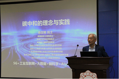 特邀请美国工程院院士、全球著名的超级计算机专家陈世卿教授,为学院全体师生带来了一场主题为《碳中和的理念与实践》的精彩专题报告,校人力资源部部长朱文凯主持会议。