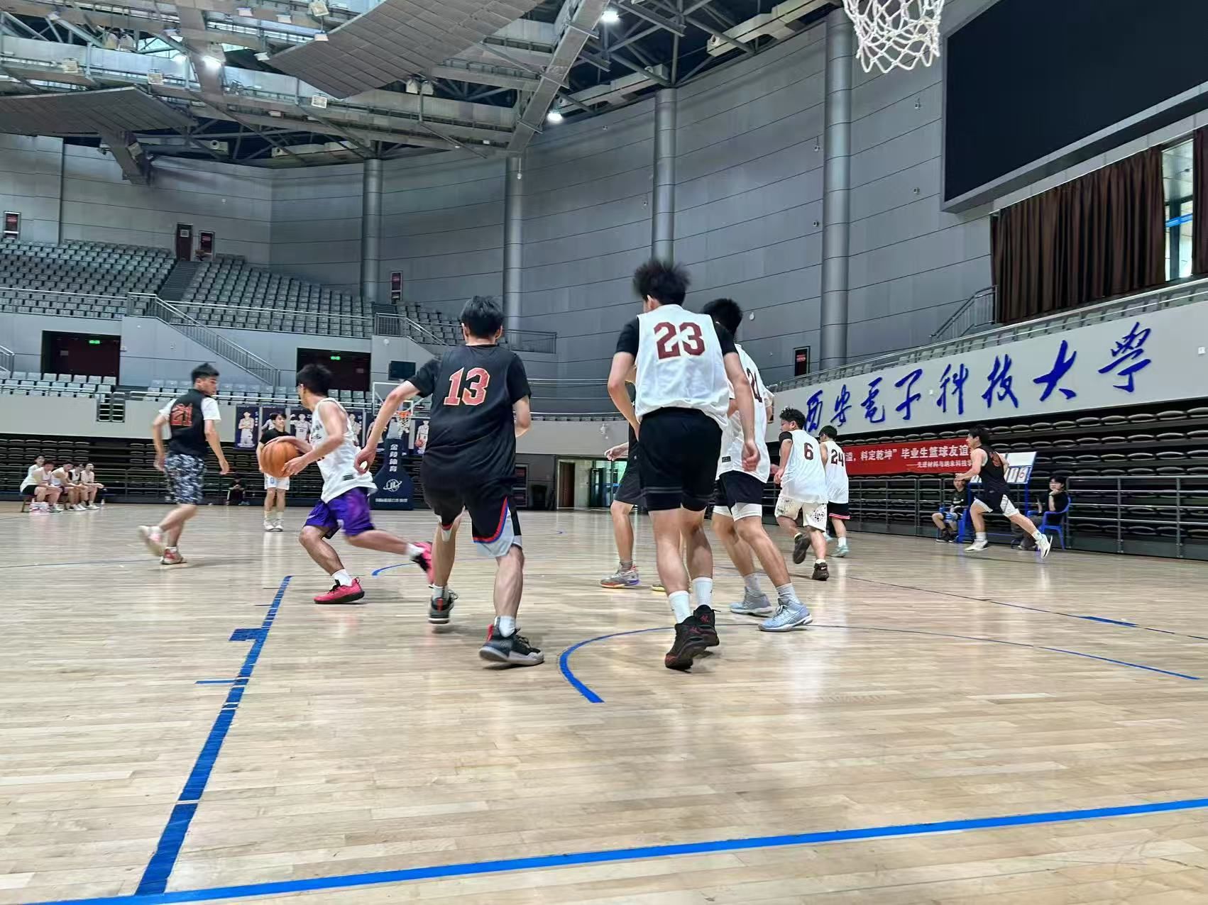 晚18:00,毕业生篮球友谊赛于远望谷体育馆篮球场正式启幕。一开场,研三代表队与大四代表队双方队员即展现出昂扬的竞技状态,凭借充沛的体能与娴熟的球技,迅速将比赛推向高潮。赛场上,攻防转换节奏紧凑,球员们在争夺篮板、抢断球权与组织进攻等环节中全力以赴,现场气氛持续升温。随着半场哨声响起,两队比分犬牙交错,胜负依旧存在悬念。