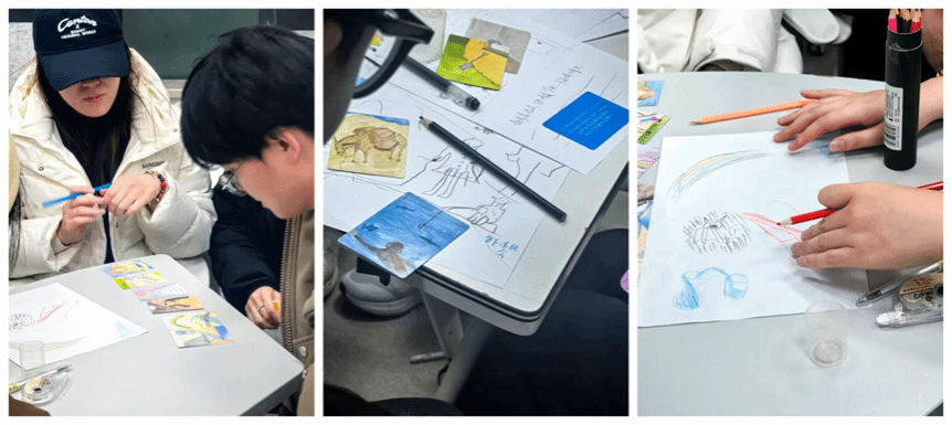 绘画创作环节为同学们提供了释放想象力的空间。大家再次抽取卡片,以卡片内容为灵感,用彩笔勾勒出心中的画面,并向组员详细解读作品背后的思考。色彩斑斓的画作中,既有对当下科研状态的呈现,也有对未来学术道路的憧憬。随后的“转折卡片”分享环节更显真挚,同学们勇敢袒露人生道路上的关键节点,无论是学业上的突破、科研中的顿悟,还是心态上的转变,都引发了现场的强烈共鸣。