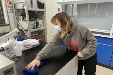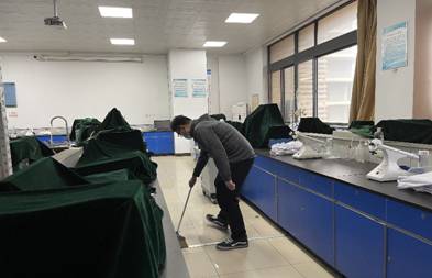 首先在庞海丽老师的协调安排下,明确了实验室重要仪器的清理注意事项并领取了清扫工具,然后对应用化学系的物理化学实验室、无机及分析化学实验室、仪器分析实验室分别进行了清扫。两人分工协作,支华倩同学主要负责对实验室的设施进行擦洗清理,细致认真地擦净了实验室每个角落;冯宇舸同学主要负责对实验室地面进行清扫。两人服从调遣,合理分工,积极完成各自的任务,完成了对实验室清扫的志愿活动。