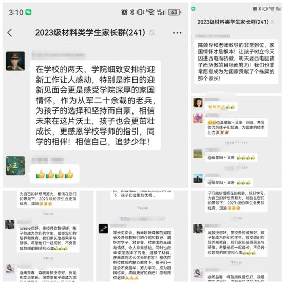 “院领导和老师教导的非常到位,家国情怀才是根本!让孩子树立今天因进西电而骄傲,明天要西电因孩子而骄傲的目标而努力!我们也非常愿意成为为国家贡献了个栋梁的那个家长!”