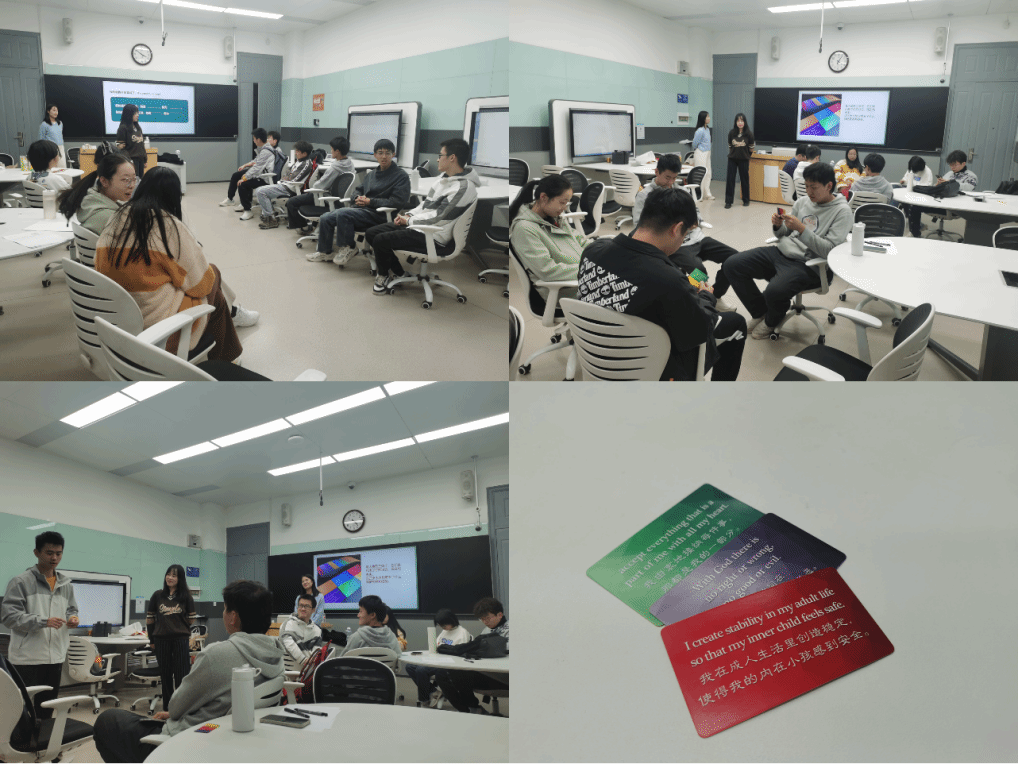 最后,在“彩虹卡,送给自己一句话”环节中,同学们围坐在一起,分享了他们在活动中的体验、感悟,互相鼓励和支持。这一过程不仅让参与者们感受到了团体的温暖,也为他们在未来的学习和生活中提供了一个强大的情感后盾。许多同学表示,通过这次活动,他们不仅对自己有了更深入的了解,也对周围的人更加心存理解和感激。