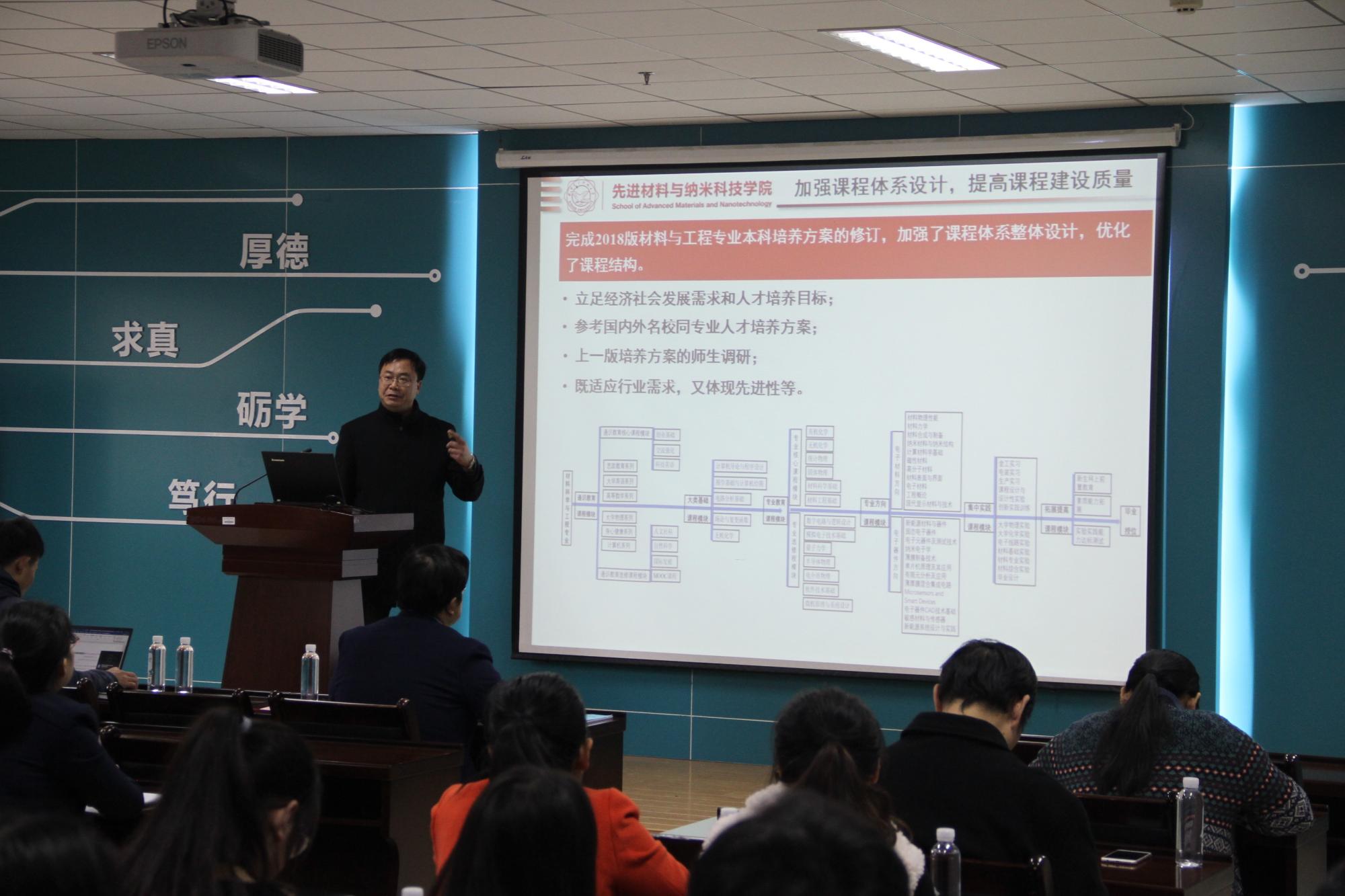 材料科学与工程专业负责人李智敏教授代表材料科学与工程系就前期的本科教育思想大讨论做了总结报告。李老师从“自觉增强师德修养,牢记立德树人使命”,“课程思政与思政课程同向同行”,“加强课程体系设计,提高课程建设质量”,“凝练专业特色方向,强化实践教学环节”,“积极申请各类项目,科研反哺教学”,“加强师资队伍建设,打造高水平教学创新团队”六个方面出发,比较全面的总结了材料专业本科教育思想大讨论取得的阶段性成果。目前材料专业教师承担了科技部、国家基金委、总装备部、陕西省科技厅等多项纵向项目以及多项校企合作横向项目,2018年发表SCI核心论文18篇,其中4篇中科院Ⅰ区论文,并且获得2019年陕西省科学技术奖1项。