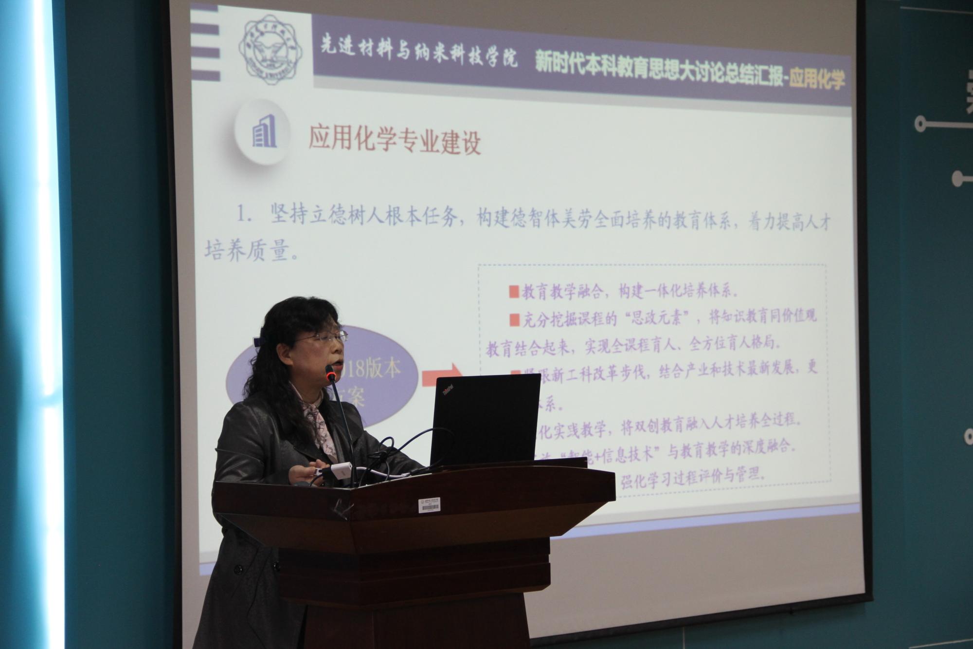 应用化学专业负责人梁燕萍教授围绕“应用化学专业建设”,“课程思政建设”,“教学模式改革创新”三个方面对前期化学系进行的本科教育思想大讨论进行了总结汇报,与全院师生共享化学专业取得的成果与经验。梁老师在总结中提到,要对专业具有全方位的认识,在教学中强化实践教学,与“智能+信息技术”等理念相结合,才能更好的促进专业的良性发展。2019年应用化学专业在理论教学和实践教学领域成果丰硕。梁燕萍教授负责的《物理化学》课程正式上线中国大学MOOC平台,李淑萍等教师申报的《甲醛防腐剂合成工艺研究虚拟仿真实验》荣获2019年省级虚拟仿真项目,应用化学专业学生在第十三届全国大学生化工设计竞赛中获得全国总决赛二等奖一项、西北赛区一等奖一项,西北赛区三等奖一项。