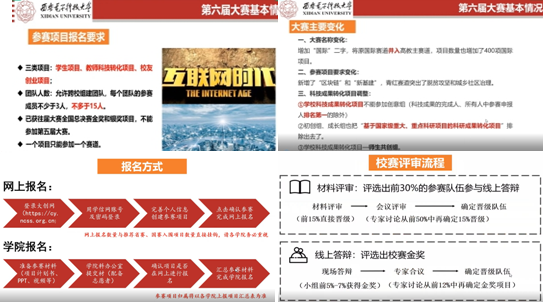首先,施建章副院长简要传达了学校关于第六届“互联网+”大学生创新创业大赛的一些工作部署和安排,包括本次大赛的赛程安排、赛制调整以及与往届大赛相比的主要变化等,主要有大赛名称变化、参赛项目要求变化、科技成果转化项目调整以及赛事时间安排、组织流程和校赛评审环节等具体内容,帮助参赛学生及时、精准地了解本次赛事全过程。