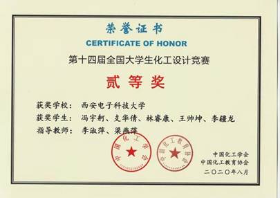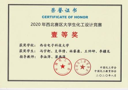 应用化学专业冯宇舸、支华倩、林睿康、王帅坤、李疆龙等5名同学组成的“九折水瓶”团队,在李淑萍、梁燕萍等老师的指导下,斩获西北赛区一等奖,晋级全国决赛,最终荣获全国二等奖。