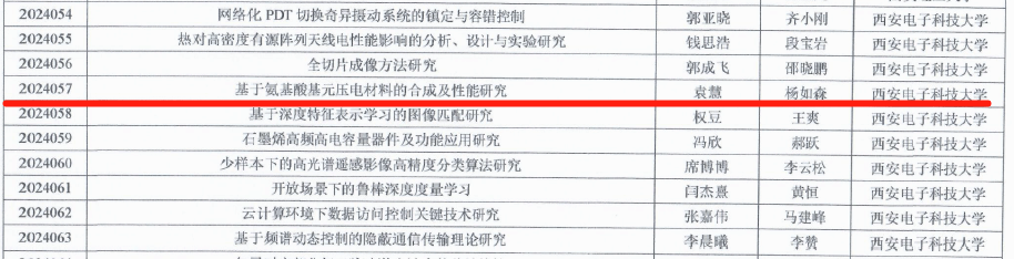 2018级博士生袁慧(指导教师:杨如森教授)所撰写的题为《基于氨基酸基元压电材料的合成及性能研究》的博士学位论文,获评“2024年陕西省优秀博士学位论文”。